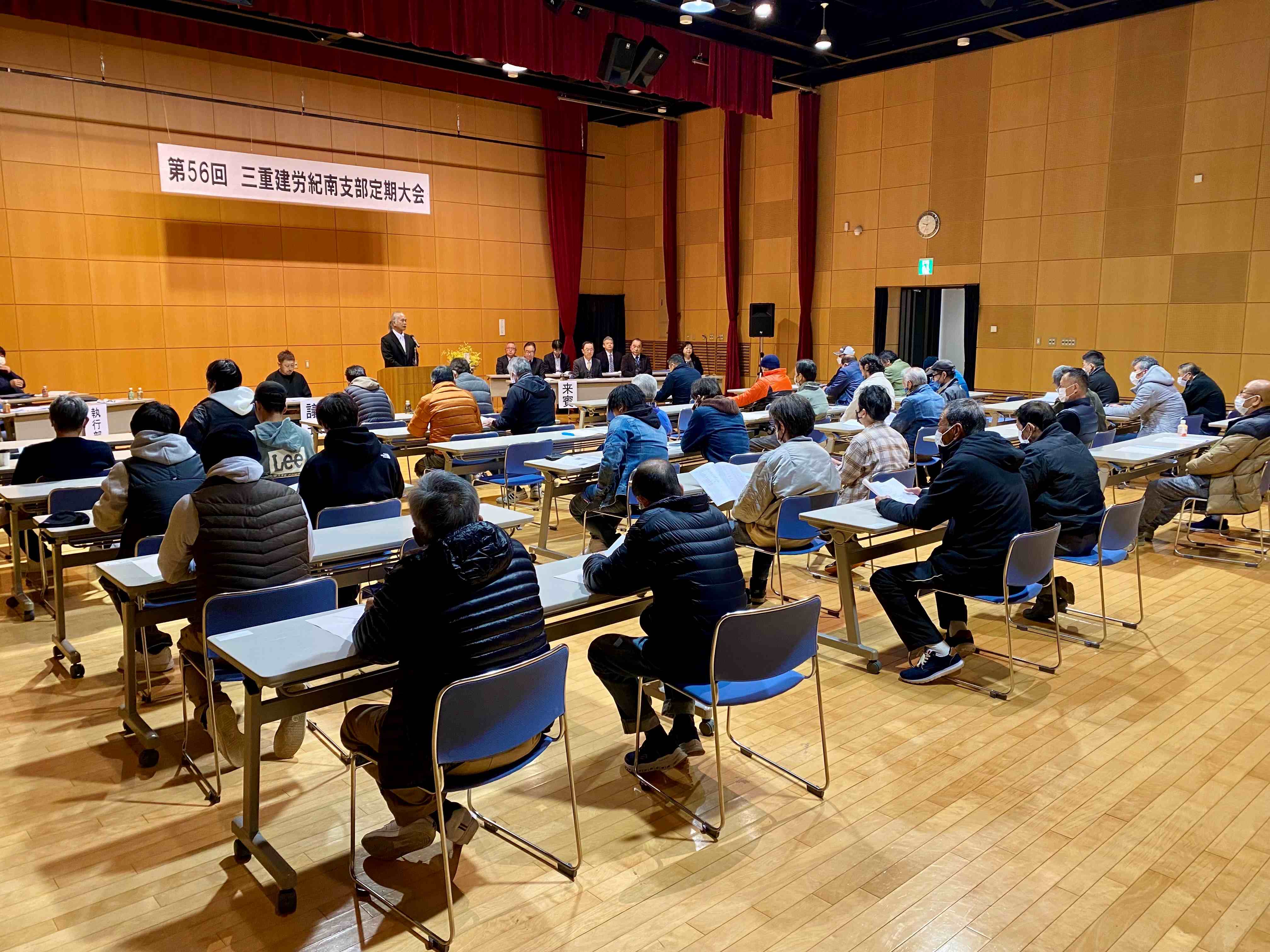 2月2日、熊野市文化交流センターにて第56回三重建労紀南支部定期大会を開催しました。昨年1年の総括や組合の諸課題について討議が行われました。